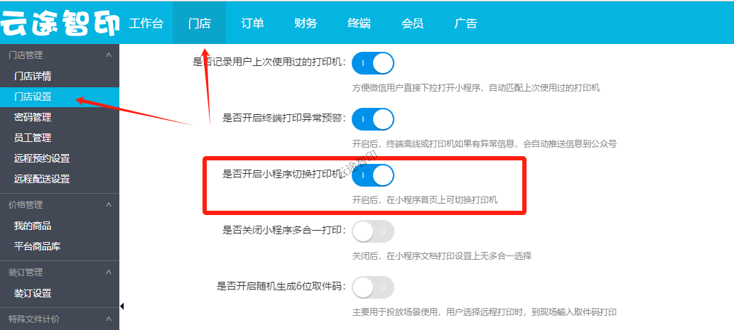 后台->门店->门店设置->是否开启小程序切换打印机->保存即可